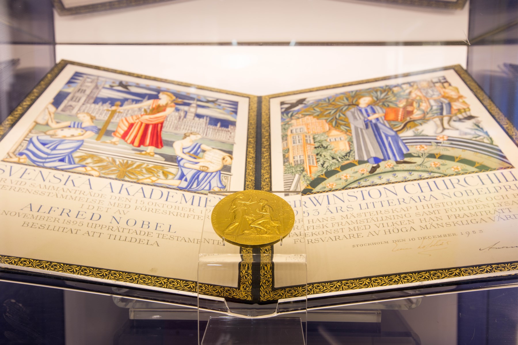 Star items are his Nobel Prize in Literature, awarded to Churchill in 1953; his wooden speech box; a collection of medallions he received throughout his life; a pair of hairbrushes made from wood from the deck of the World War II ship, HMS Exeter; and a miniature paint box.