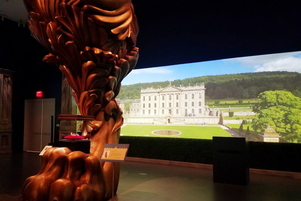 Immediately upon entering the exhibition, one sees a Brobdingnagian-sized copy of a table leg from Chatsworth that functions as both an exhibition pillar as well as a pedestal to hold the case containing the Devonshire Tiara. On the surrounding walls, changing video views of the house’s exterior and grounds envelope the visitor.
