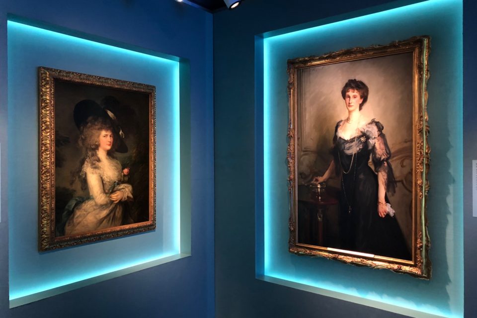 Thomas Gainsborough’s 18th-century portrait of Georgiana, 5th Duchess of Devonshire juxtaposed next to a 19th-century portrait of Evelyn, 9th Duchess of Devonshire by John Singer Sargent.