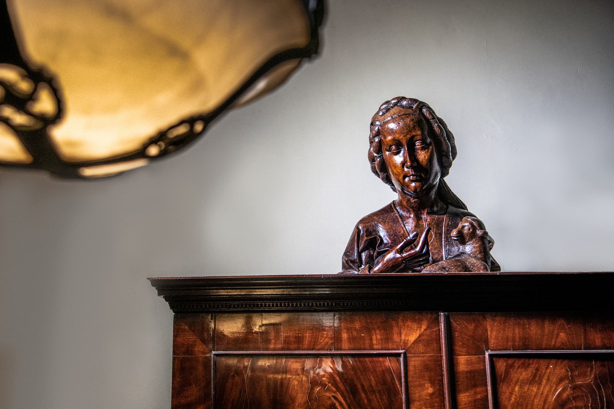 Nothing is currently known about the whereabouts of St Agnes from then until it came into the collection at Anglesey Abbey when it was purchased sometime between 1932 and 1940 by the house’s owner Lord Fairhaven, a keen collector of sculpture and statues. However, the bust was wrongly described in his 1940 inventory as ‘The Virgin and the Lamb’ and has been on display on top of a cupboard in the Windsor Bedroom for many years.