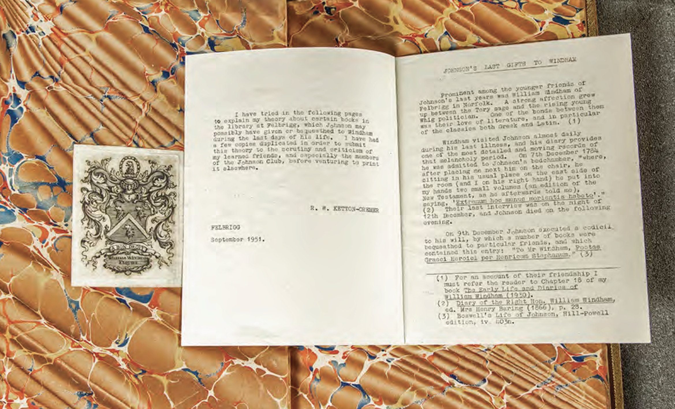 It was gratifying, therefore, to find tucked away inside the third volume of the Greek poets a small eight-page typescript pamphlet entitled ‘Johnson’s Last Gifts to Windham’. This was written by Ketton- Cremer in September 1951. In it he explains his theory that the Johnson books might be the volumes expensively rebound in Russia leather during the early 19th century, and that they had been accorded special treatment by his ancestor Admiral William Lukin (1768–1833) after he had inherited Felbrigg in 1824. Ketton-Cremer wrote: ‘I can imagine the Admiral feeling that some special reverence should be paid to Johnson’s last gifts, and despatching them to a binder to be recased in the grandest style’ (Fig. 4).