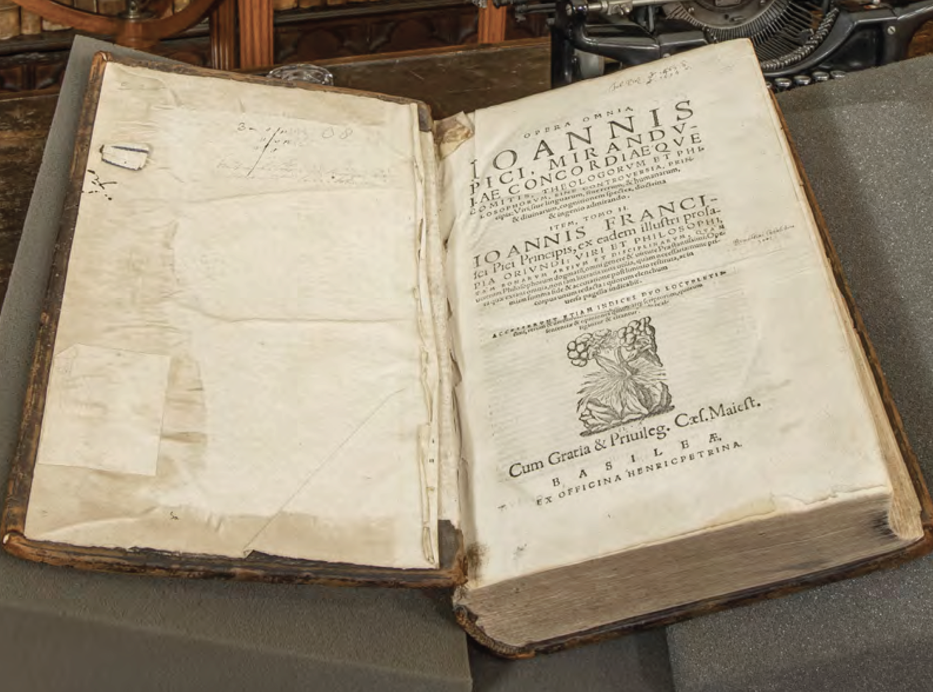 Fig. 5: An edition of the works of Giovanni Pico della Mirandola, Opera omnia, bearing William Windham’s faded pencil inscription (on the blank paste-down opposite the title-page) recording Johnson’s ownership ©National Trust Images/Paul Bailey