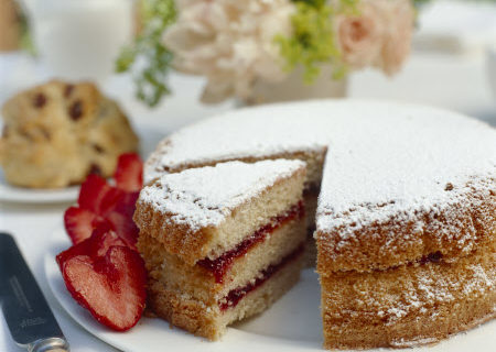 - Cool on a wire rack. When cold, cut the cake in half and spread the bottom half with raspberry jam and whipped cream. Put the top back on lightly and dust with icing sugar.