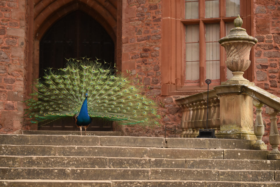 A peacock displaying his tail feathers at Powis Castle, Wales