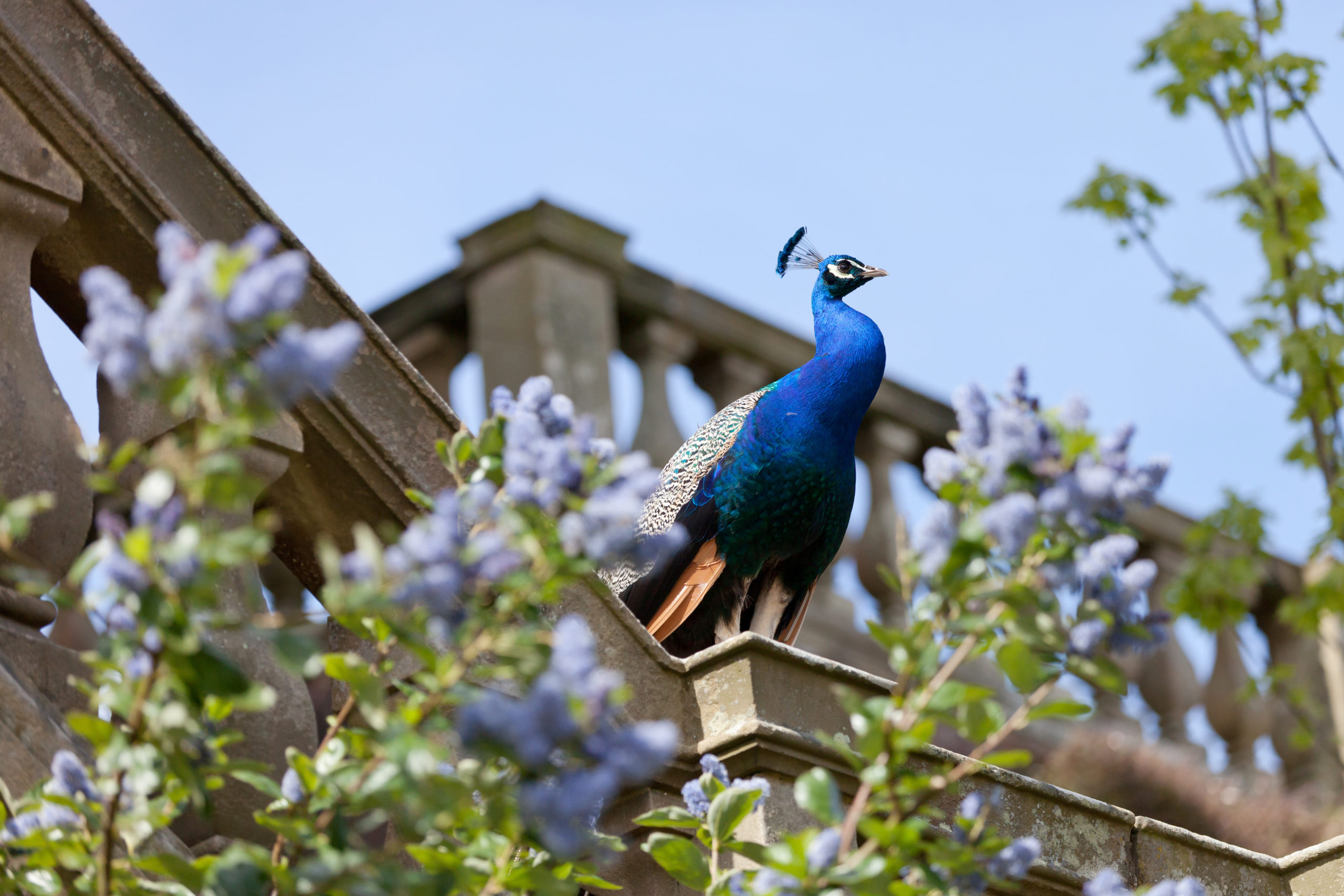 Peacock on the terrace at Powis Castle and Garden, Powys, Wales.