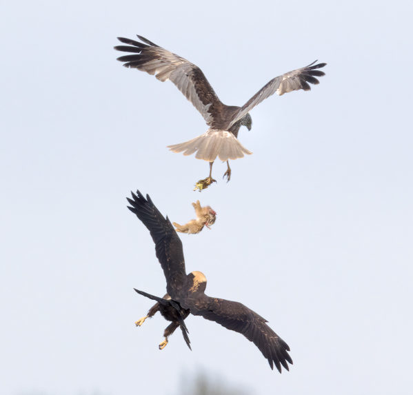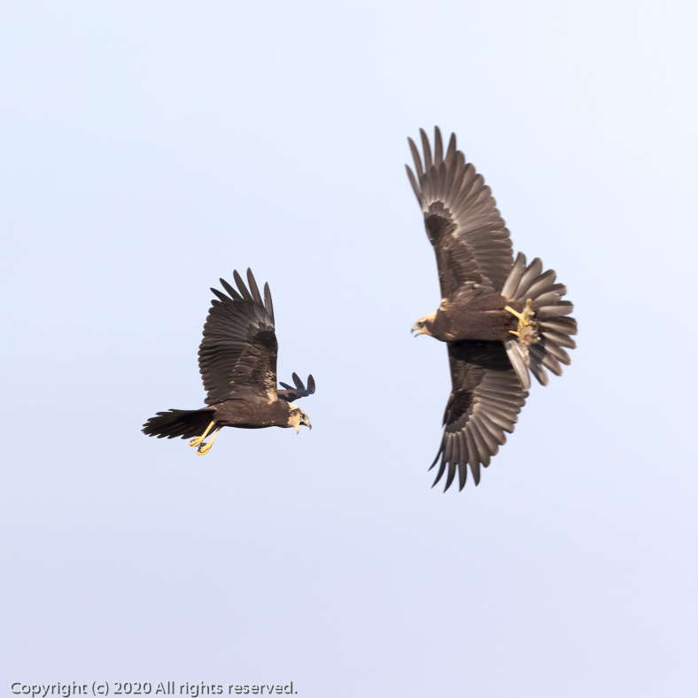 Marsh harrier male parent passes food to juvenile ©Richard Nicoll