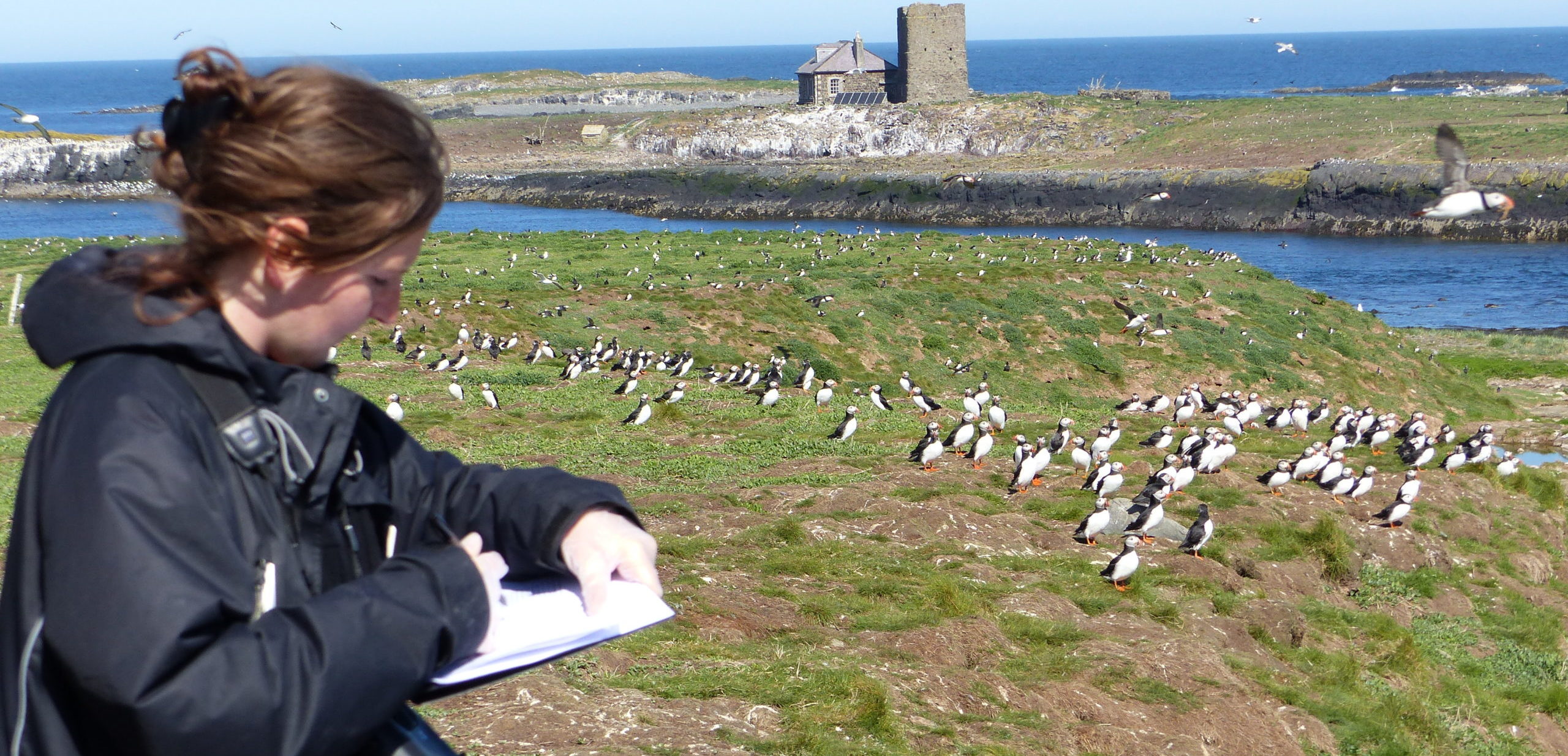 Harriet Reid, National Trust Ranger for the Farne Islands, carrying out checks on the Puffins. ©Matthew Scarborough