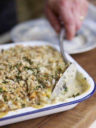 - Mix oats, hazelnuts and breadcrumbs together and spread thickly over the top so the sauce does not show at all.