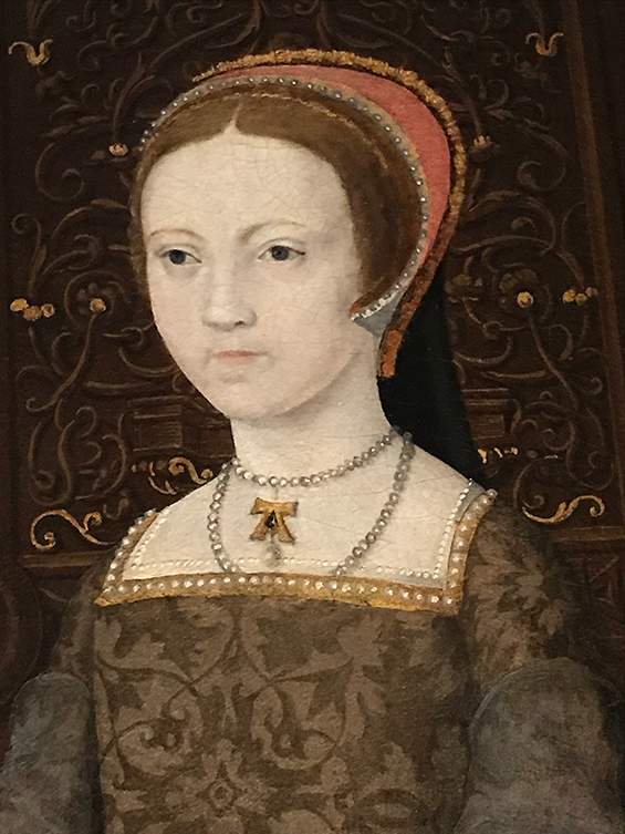 Detail of ‘Lady Elizabeth’, wearing her mother’s initial pendant, a letter “A.” from painting The Family of Henry VIII, c. 1545, by unknown artist, Hampton Court Palace ©The Royal Collection Trust
