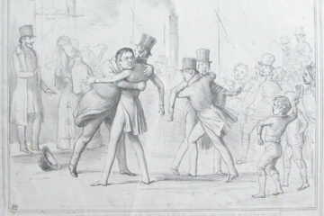 Print, lithograph, A Leaf out of Nicholas Nickleby with slight variations (after Nicholas Nickleby by Charles Dickens), by John Doyle (H.B.) (Dublin 1797 ? London 1868). Victorian political print. Men in top hats fighting.