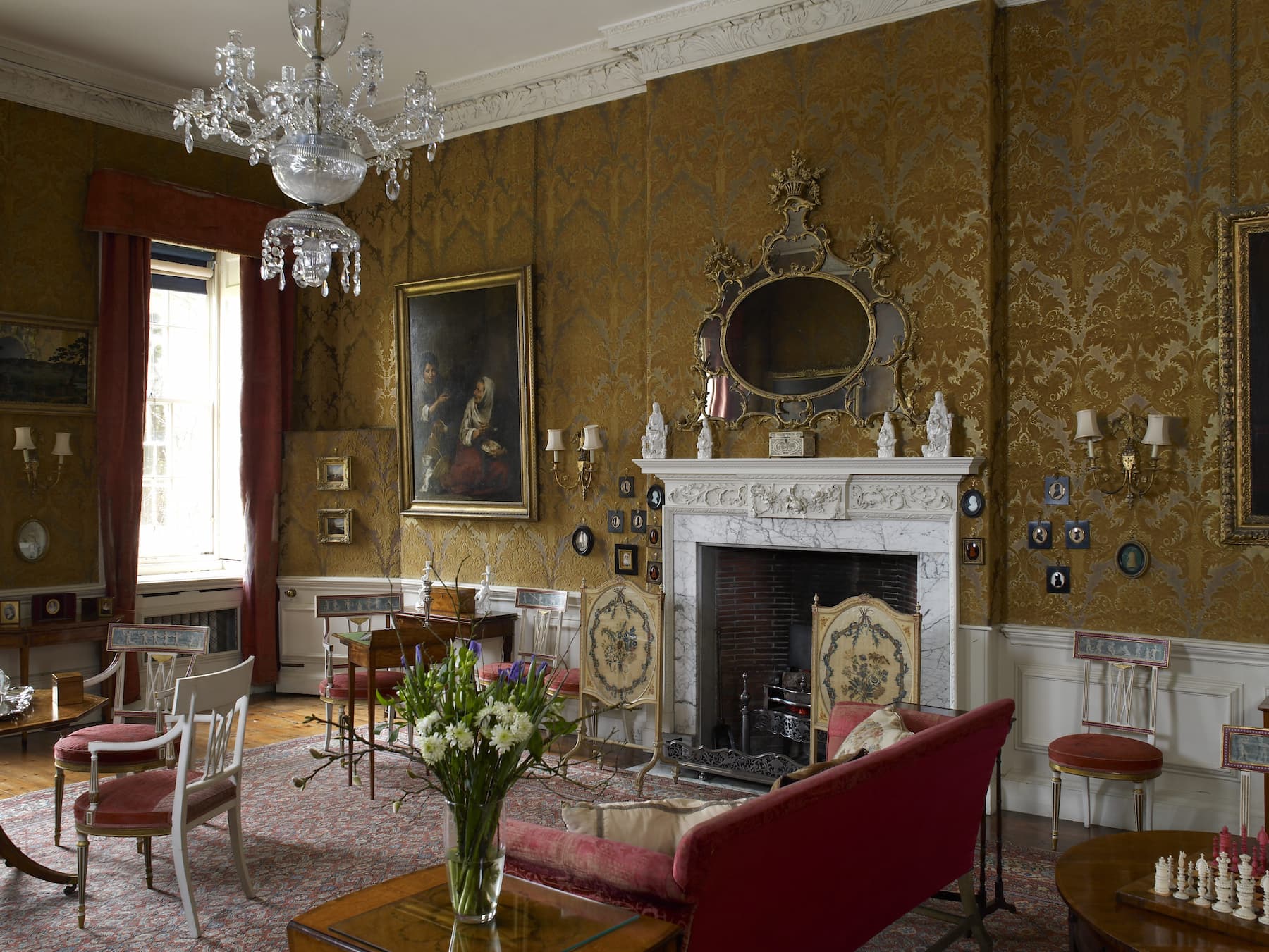 Royal Oak committed to funding the restoration of the drawing room. This room was re-imagined in the 1930s (see Figure 1) and will now be re-presented as it would have been decorated in Blathwayt’s time. The room will be recast as the Gilt Leather Parlor, showcasing the books and maps which Blathwayt poured over as essential tools for his overview of international trade. This room was originally decorated with gilt leather wall hangings, like those seen in Figures 2 and 3.